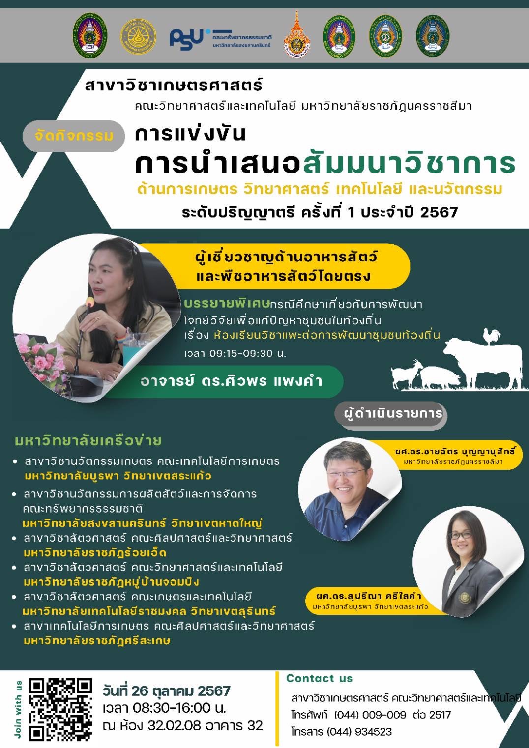 โครงการแข่งขันการนำเสนอสัมนาวิชาการด้านการเกษตร วิทยาศาสตร์ เทคโนโลยี และนวัตกรรม ระดับปริญญาตรี ครั้งที่ 1 ในวันที่ 26 ตุลาคม 2567 ณ มหาวิทยาลัยราชภัฏนครราชสีมา