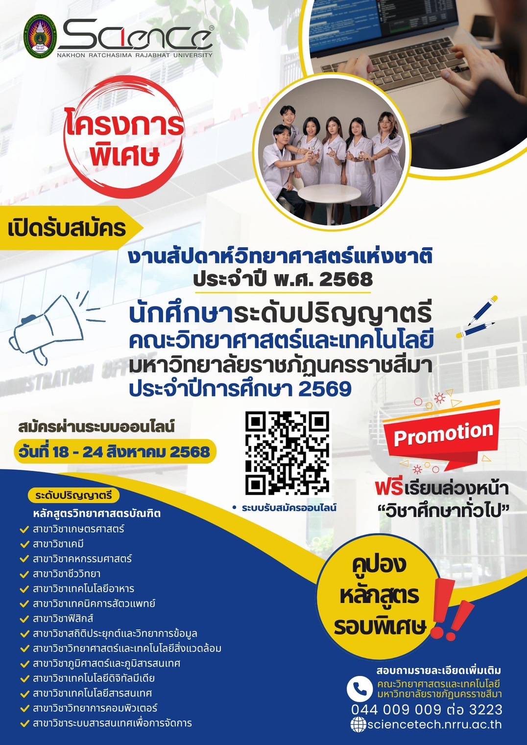 คณะวิทยาศาสตร์และเทคโนโลยีNRRU เปิดรับสมัครโครงการคูปองหลักสูตร(วิทยาศาสตรบัณฑิต ระดับปริญญาตรี 4 ปี) ประจำปีการศึกษา 2569 : รอบพิเศษ